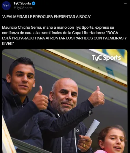 “Tenho muito claro o que disse. Me perguntaram se estávamos pensando no Palmeiras ou se estávamos preocupados e respondi que o Boca está ocupado trabalhando. Mas, do outro lado, com certeza o Palmeiras também está preocupado por enfrentar o Boca. Afirmo. Isso é verdade. Agora eles possuem um grande elenco, uma importante experiência, uma juventude com um técnico que entendeu como jogar a Copa. A mística e a história jogam também de alguma maneira importante, além da ilusão de chegar em mais uma final. Palmeiras é um rival muito complicado”, disse Chicho, em entrevista à Tyc Sports.