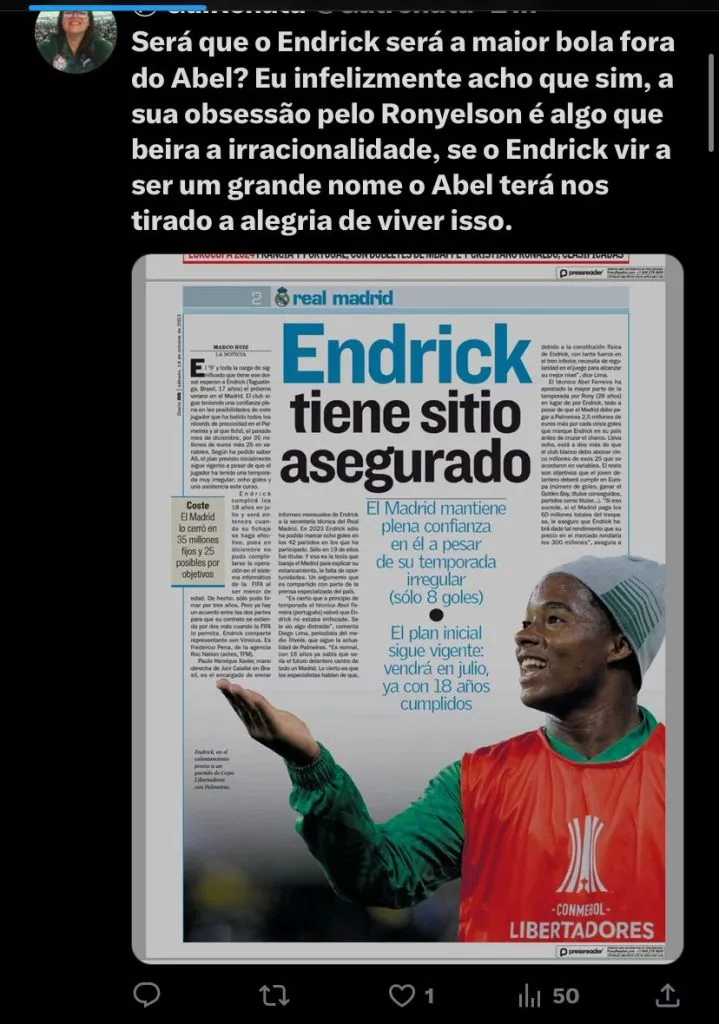 Com somente o Brasileirão até o final da temporada, o Palmeiras ainda tem 12 jogos pela frente. Então, com isso, Abel Ferreira espera uma tomada de atitude dos líderes, mas também vai finalmente atender o pedido da torcida ao colocar Luís Guilherme, Kevin é principalmente Endrick para jogar, além deles, o zagueiro Neves e Fabinho também são cotados para serem chamados. A ideia inicial é recuperar a confiança dos medalhões e também chamar os mais jovens para o jogo.