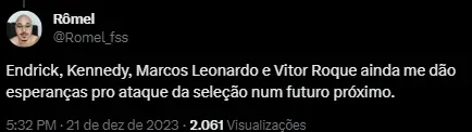 Os nomes que estavam escalados para a Seleção da Copa, já são nomes batidos e que causaram pouquíssimo efeito na fase de classificação. Com a disputa Olímpica em vista, nomes jovens terão mais notoriedade, assim como Kennedy que, inclusive, Fernando Diniz já disse que tem potencial decisivo de Copa do Mundo.
