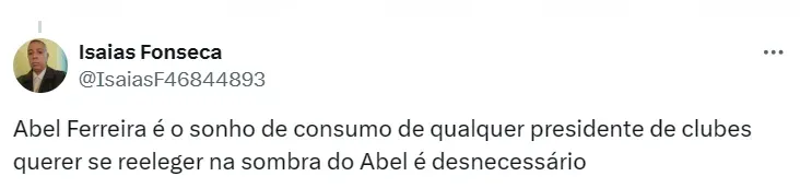 “Meu desejo é, se eu for reeleita presidente do Palmeiras, que o Abel fique conosco até o último dia do meu mandato”, pontuou. O novo vínculo do treinador com o Verdão é válido até o fim de 2025.