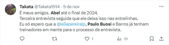 Recentemente, Abel desabafou durante entrevista coletiva sobre o cansaço com o intenso calendário do futebol brasileiro, deixando em aberto seu futuro no Palmeiras.