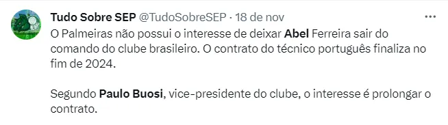 Diante da repercussão, o vice-presidente do clube, Paulo Buosi, foi questionado sobre Abel Ferreira, durante o evento de sorteio dos grupos do Paulistão 2024.