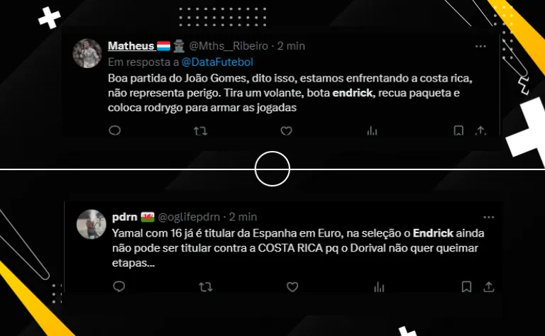 Para o 2° tempo, boa parte da torcida comentou: “seria interessante tirar um volante e colocar o Endrick, a Costa Rica não vai atacar“. Em contrapartida, comparou com Lamine Yamal, jovem da Espanha e do Barcelona: “Yamal com 16 já é titular da Espanha em Euro, na seleção o Endrick ainda não pode ser titular contra a Costa Rica porque o Dorival não quer queimar etapas“.