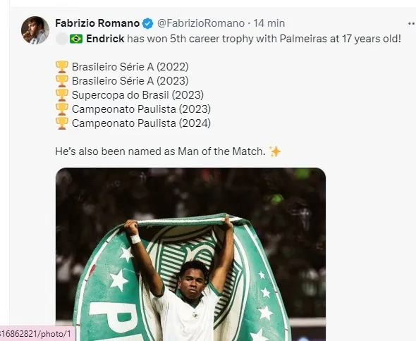 Com 17 anos, Endrick venceu cinco competições relevantes com a camisa do Palmeiras. Entretanto, foi fundamental no título Brasileiro que estava inviável na temporada passada.