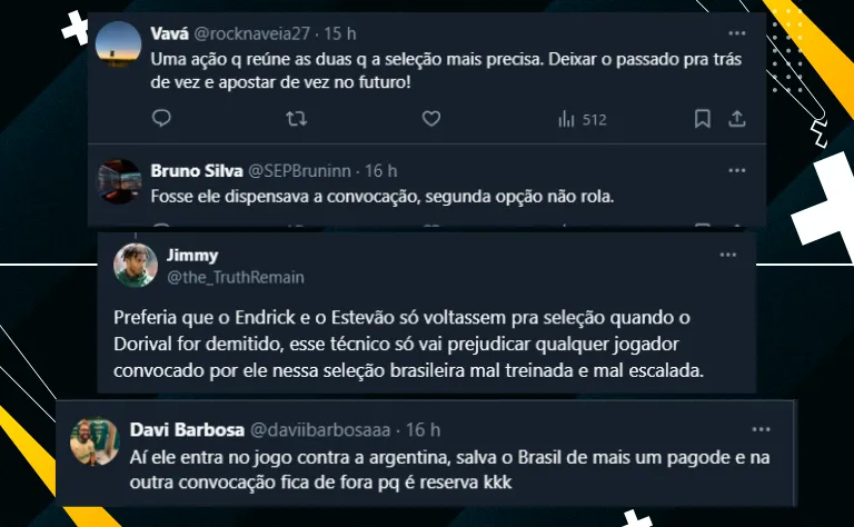 Até por isso, por conta do corte de Neymar, o garoto revelado no Verdão foi convocado para a Seleção Brasileira nesta sexta-feira (14). Ele foi chamado por Dorival Júnior após a lista inicial e o tema repercutiu entre palmeirenses.