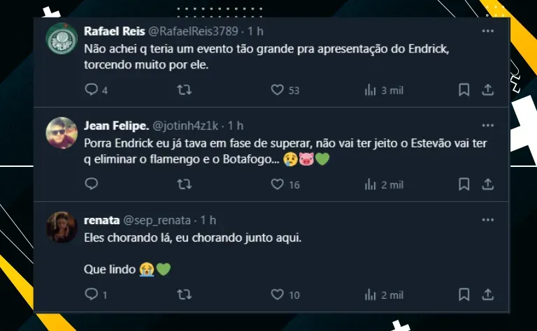 Por fim, Endrick falou sobre a escolha pelo Real: “Quando começaram as negociações, eu só perguntava para o meu pai se o Real Madrid estava. Não importava nenhum clube. Deus cumpriu esse meu sonho”, finalizou.