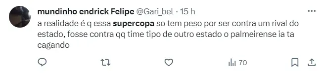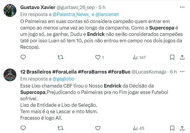 Muitos dos torcedores do Verdão foram até as redes sociais questionarem a ausência de Endrick em um jogo tão decisivo e em um clássico tão marcante. Confira os comentários ao final da matéria.