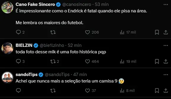 Nas redes sociais, os torcedores palmeirenses celebraram o tento de Endrick e também a sua comemoração, que muitos comentaram como uma celebração histórica para a carreira.