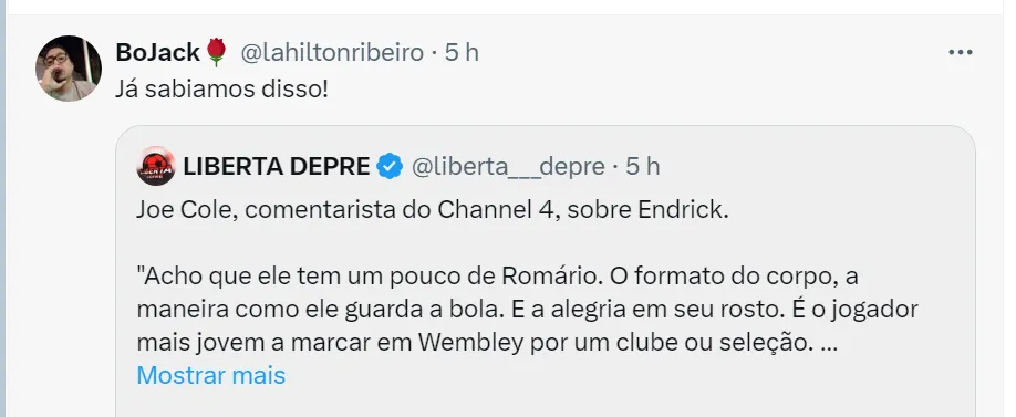 Após ser exaltado pela imprensa inglesa, foi a vez de Joe Cole, ex-jogador da Seleção da Inglaterra, elogiar Endrick e comparou a cria do Verdão com Romário, campeão do mundo pela amarelinha em 1994.