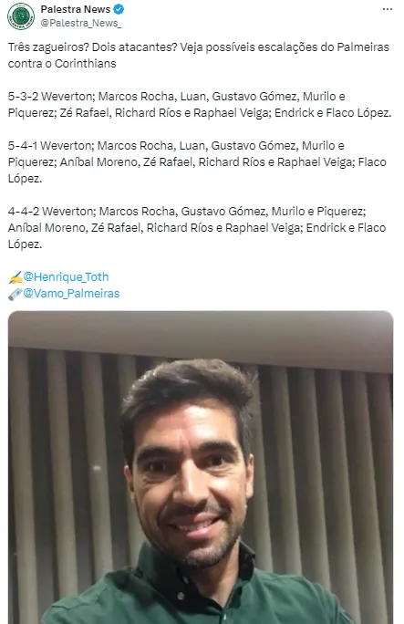 O colega Henrique Toth trouxe duas escalações que Abel pode mandar a campo para o clássico contra o Corinthians. A única diferença dos esquemas e que sinaliza a principal dúvida do treinador é que em uma está Endrick e na outra o argentino Aníbal Moreno.
