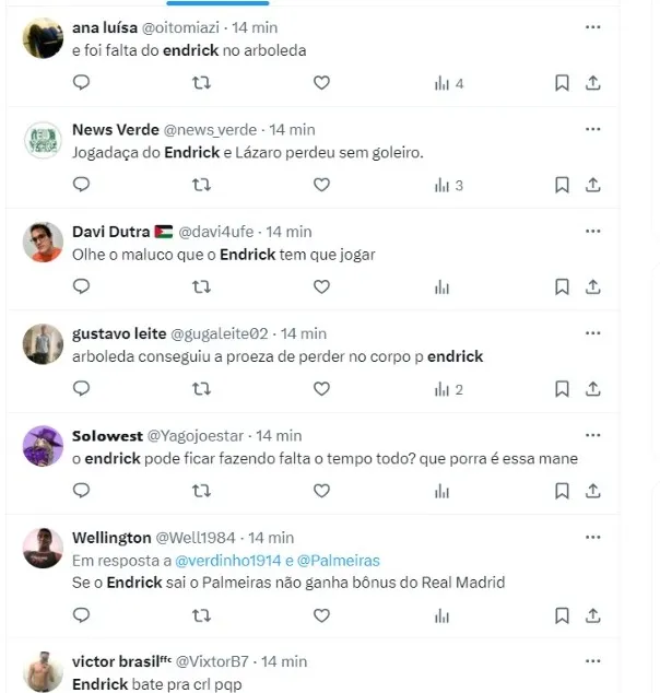 “Endrick acorda cara tá parecendo o Rony hoje“, escreveu um torcedor. “A cabeça do Endrick já está em Madrid“, completou.