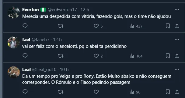 Inclusive, por mais que tenha derrotado o Santos na final do Paulistão e esteja classificado nos mata-matas, os torcedores vêm reclamando da falta de inspiração do time, principalmente de algumas semanas para cá.