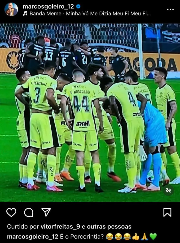 “É o Porcorintia?”, indagou Marcos, brincando com o novo uniforme do rival. Na sequência, o ídolo do Palmeiras foi respondido por um internauta, e não deixou ‘barato’. “Sério que tao falando que a camisa eh verde?? Eh zueira né??”, questionou um torcedor nos comentários, sendo prontamente respondido por Marcos, que justificou a “resenha”.