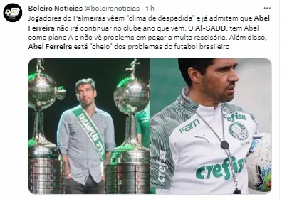 “Eu dei a informação de que o Palmeiras tem interesse, com essa proposta que já mexeu com a cabeça do Abel, em tentar fazê-lo mudar de ideia de deixar o Clube, em uma reunião na próxima semana”, revelou o jornalista nas redes sociais.