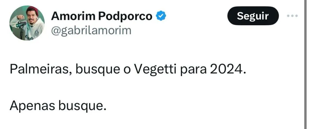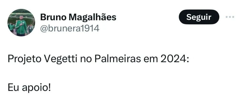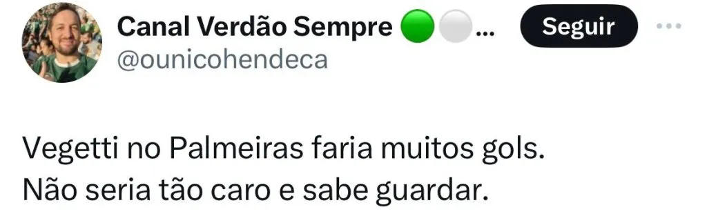 “Vegetti no Palmeiras faria muitos gols. Não seria tão caro e sabe guardar as bolas na rede”, brincou um membro da torcida. “Projeto Vegetti no Palmeiras em 2024, eu apoio”, brincou um internauta.