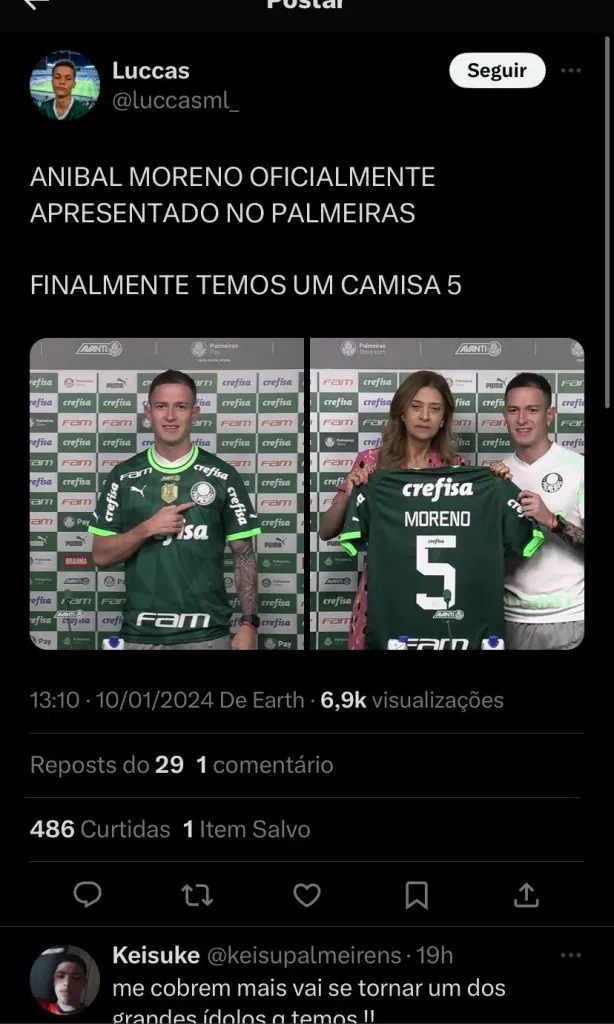 Na reapresentação do elenco, os três reforços anunciados pelo Palmeiras estavam presentes: Aníbal Moreno, Bruno Rodrigues e Caio Paulista. O argentino de 25 anos foi apresentado nesta quarta-feira (10) para a imprensa.