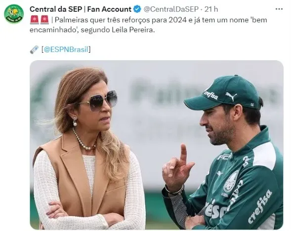 De acordo com a reportagem da ESPN Brasil, o Verdão já tem um nome com situação avançada para o ano que vem. Segundo matéria publicada pelo portal, as informações foram dadas pela presidente do clube, Leila Pereira, após o encerramento de sua coletiva desta quarta-feira (11), na Academia de Futebol.