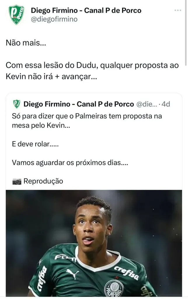 Segundo Diego Firmino, com essa lesão fatídica lesão do atacante Dudu, que ficará parado por pelo menos 5 meses, qualquer proposta que chegar ao Kevin, Leila Pereira não irá mais avançar nas tratativas. Vale lembrar que recentemente, o Cria da Academia voltou a receber sondagens, e a mandatária estava disposta a vendê-lo. No entanto, pelo menos para esse final de temporada, isso não acontecerá mais.