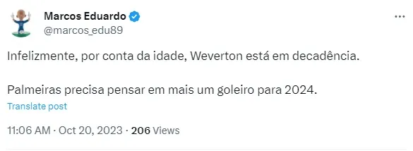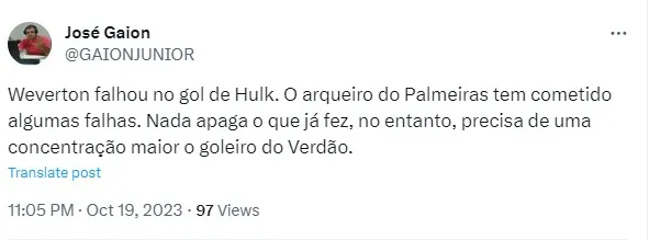 “Infelizmente, por conta da idade, Weverton está em decadência. Palmeiras precisa pensar em mais um goleiro para 2024”, disse um torcedor. Weverton falhou no gol de Hulk. O arqueiro do Palmeiras tem cometido algumas falhas. Nada apaga o que já fez, no entanto, precisa de uma concentração maior o goleiro do Verdão”, comentou um internauta. “Quando o Prass estava tomando frango pra caramba, muita gente passou pano também. Weverton está em declínio técnico. O Palmeiras precisa de um novo goleiro urgente”, implorou um fanático membro do Palestra.