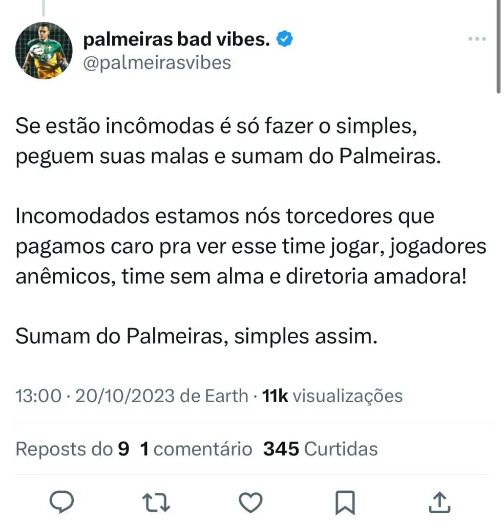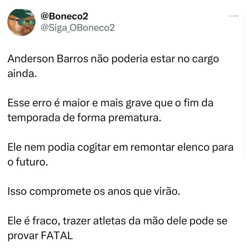 Quem também foi muito criticado por não trazer reforços ao Clube foi Anderson Barros, que não conseguiu convencer nenhum atleta a se mudar para a Academia de Futebol. O dirigente foi muito xingando ontem na derrota do Palmeiras para o Atlético Mineiro por 2 a 0, no Allianz Parque. E quem está revoltado com as críticas da torcida ao dirigente são os torcedores do Verdão.
