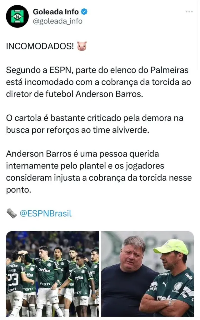De acordo com a apuração da ESPN, parte do elenco do Palmeiras está incomodado com a cobrança da torcida ao diretor de futebol Anderson Barros. O cartola é bastante criticado pela demora na busca por reforços para o time alviverde. Anderson Barros é uma pessoa querida internamente pelo plantel e os jogadores consideram injusta a cobrança da torcida nesse ponto.