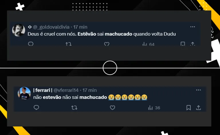 “Não Estevão não sai machucado”, “Aí meu Deus…. Estevão machucado??” e “Deus é cruel com nós. Estêvão sai machucado quando volta Dudu“, foram alguns comentários.