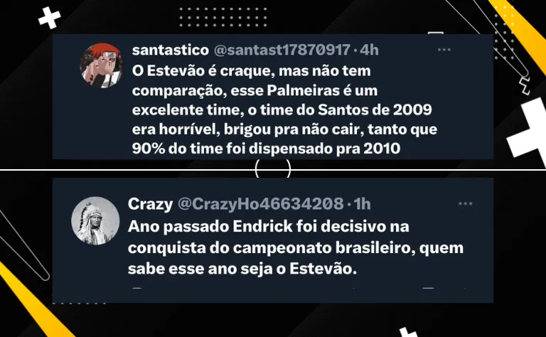 Os internautas têm elogiado muito Estêvão, que faz uma grande temporada no Palmeiras: “O jogador mais promissor vindo da base de um clube atuando no Brasil desde o próprio Neymar”, escreveu um torcedor.