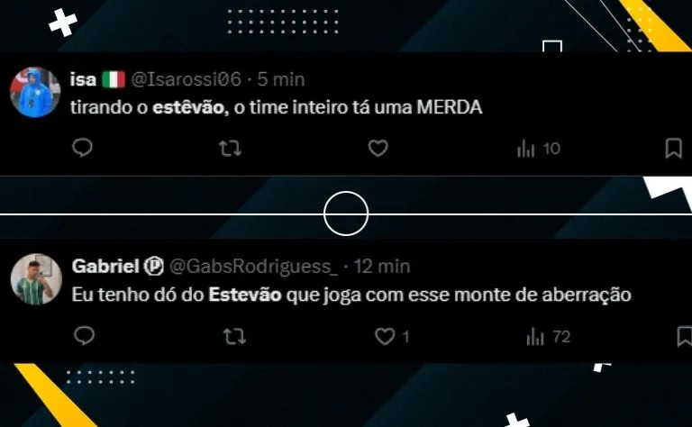 “Estevão é a única coisa que funciona nesse Palmeiras, não é que esteja destruindo, mas é o único que vem jogando bem!”, comentou um palmeirense. “O time não tem técnico, é um catado de imbecis (fora o Estevão) que não tem tática nem técnica nenhuma”, disparou outro.
