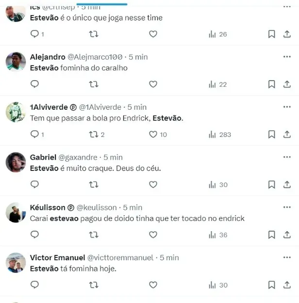 “É Estevão joga muito, mas tem vezes que dava pra sair gol se ele passasse a bola, já é o segundo jogo que ele perde gol/assistência por causa disso“, escreveu um torcedor.