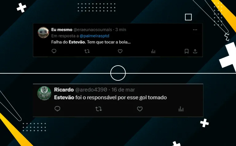 “Falha do Estêvão. Tem que tocar a bola“. “Ele foi o responsável pelo gol tomado“. Uma torcedora do Palmeiras disse algo parecido sobre a escolha feita pelo jovem atacante: “Ele não pode querer resolver todo o lance sozinho. Contra três jogadores, deveria ter parado e recomeçado“.