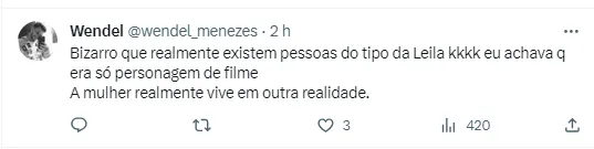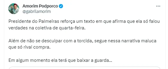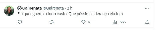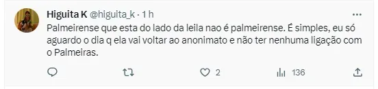 O fato em si fez ela receber uma enxurrada de críticas. Porém, parece que ela continua convicta de suas declarações. Isso porque ela acabou compartilhando, em seu Twitter, um trecho de um texto que elogia sua postura: “Leila Pereira: coerente, verdadeira e transparente. Leila Pereira não tem medo de bandidos. Não vai dar ingressos, caravana de ônibus, salas alugadas, nem telefone celular”, publicou.