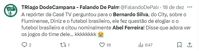 E um super jogador do time inglês lembrou de Abel Ferreira durante a disputa da competição. O meia português, Bernardo Silva, revelou acompanhar o futebol brasileiro, e fez questão de elogiar o compatriota, técnico do Verdão.