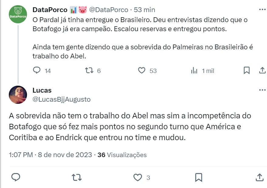 “Eu acho que o Abel acertou, porque quem treina o jogador é o Abel, nós não vemos os treinos. Nenhum treinador é louco de deixar no banco um cara que ele está vendo que está arrebentando nos treinos”, disse.