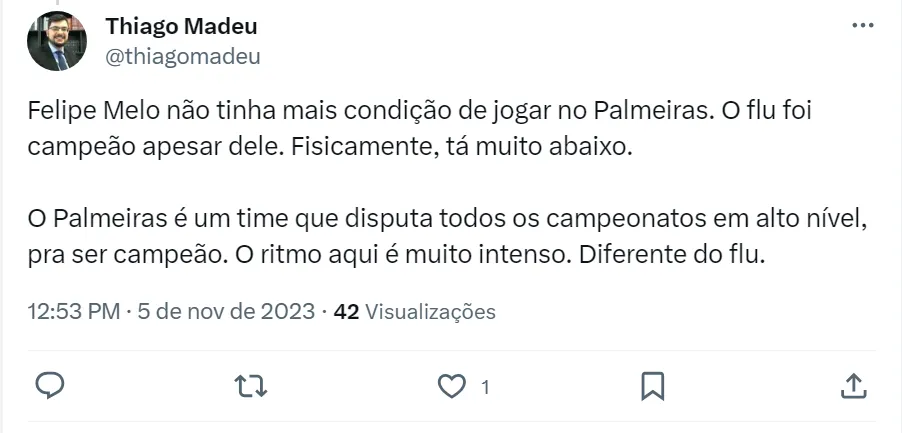 Outros torcedores palestrinos discordam e acreditam que o ciclo do volante no Palmeiras foi encerrado na hora certa. Felipe Melo tem contrato com o Fluminense até dezembro do ano que vem.