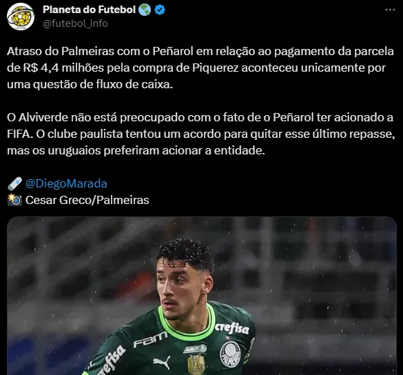 Piquerez foi contratado no começo de 2021 junto ao Peñarol por 3,8 milhões de dólares (R$ 19,77 milhões na cotação da época). O acerto foi feito por meio de parcelamento. Todos os outros vencimentos já foram pagos pelo Verdão, restando somente uma última parcela no valor de 900 mil dólares (R$ 4,38 milhões).