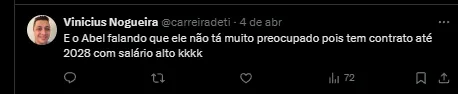 A situação do jogador não é nada boa. Ele ainda não se firmou na equipe de Abel Ferreira e apesar de ter chegado com muita expectativa, não consegue performar bem. O treinador português já falou sobre o momento dele e como ele vai ser usado.