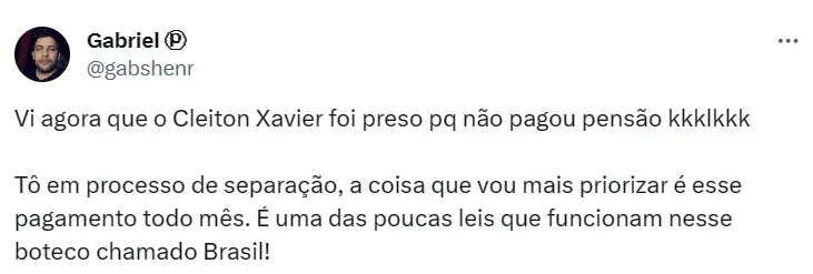 Além dessa questão de pensão, Cleiton Xavier responde por um processo por ameaça (incluindo medida protetiva baseada na Lei Maria da Penha) e um outro que envolve busca e apreensão de veículo.