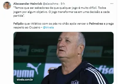 “A gente ganhou do Palmeiras em São Paulo, e perdeu em casa para o Coritiba, que era o último. Tem que jogar, não tem que falar. Temos que ter os pés no chão. Ganhamos do Palmeiras, mas perdemos domingo passado. Temos que ser sabedores que todos os jogos são difíceis, todos jogam por um objetivo. O jogo vira uma decisão. Temos que ter pés no chão, nem tudo é bonito, nem tudo é feio”, completou Felipão.