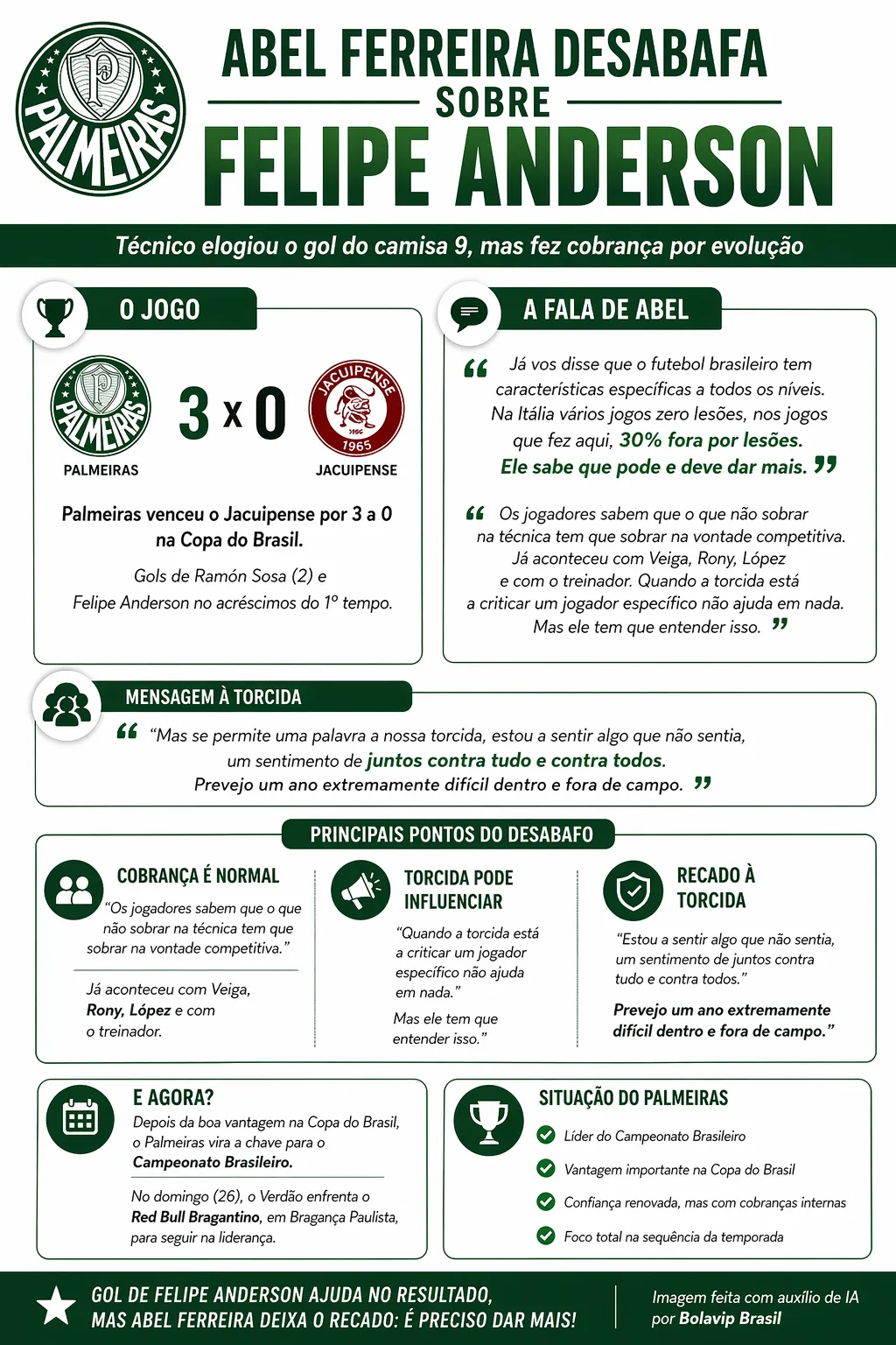 Felipe Anderson tem sido um dos alvos da ira da torcida do Palestra, entretanto, ao marcar o gol que certamente dá segurança pra a segunda partida do mata-mata, ganhou elogios e foi alvo de Abel na coletiva, porém, neste caso, para um desabafo positivo do treinador.