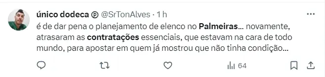 Nos últimos dias, Diego Costa foi oferecido ao Palmeiras. O atacante de 35 anos deixou o Botafogo após o fim da temporada de 2023 e está sem clube. A diretoria palmeirense recusou a oferta.