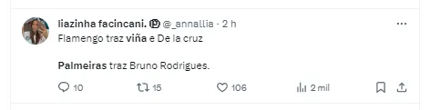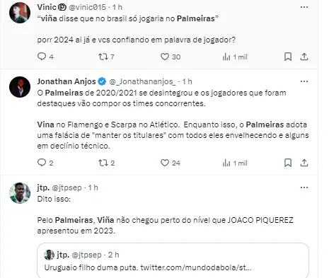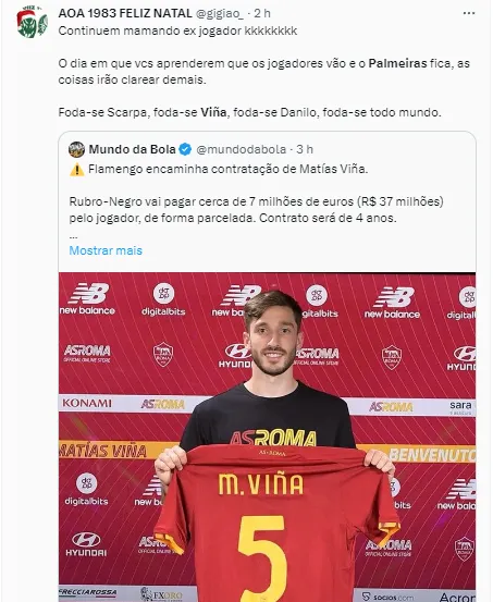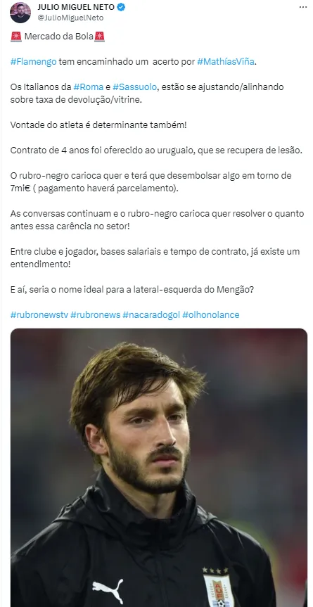 “Flamengo tem encaminhado um acerto por Mathías Viña. Os Italianos da Roma e Sassuolo, estão se ajustando/alinhando sobre taxa de devolução/vitrine. Vontade do atleta é determinante também”, iniciou o colega.
