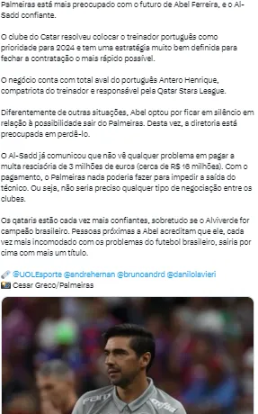 Apesar disso, um outro assunto que vem chamando atenção dentro do Palmeiras é sobre o treinador Abel Ferreira. Ele vem tendo sua saída especulada para um time do Catar e uma atualização acabou de ser exposta.
