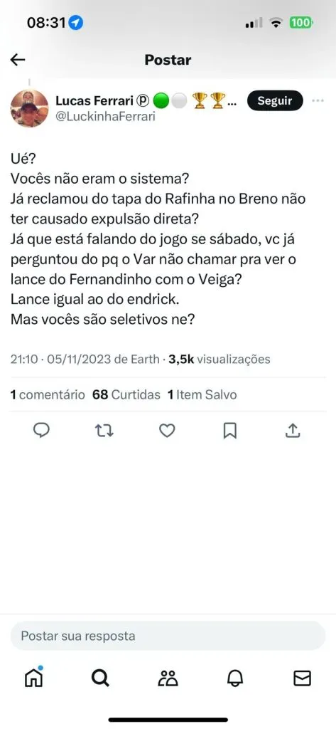 “Ontem à noite, você tem uma cotovelada com o braço acima do ombro. O VAR sequer chamou, podia decidir o jogo num campeonato que está sendo decidido nos mínimos detalhes por vagas de Libertadores. E poderia tirar o jogador da rodada da quarta-feira”, afirmou o diretor flamenguista.