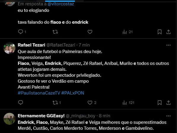 Endrick também ganhou elogios da torcida palmeirense. Apesar de não ter marcado, o camisa nove foi pra cima da defesa da Ponte Preta, fez grandes jogadas e participou de dois gols.
