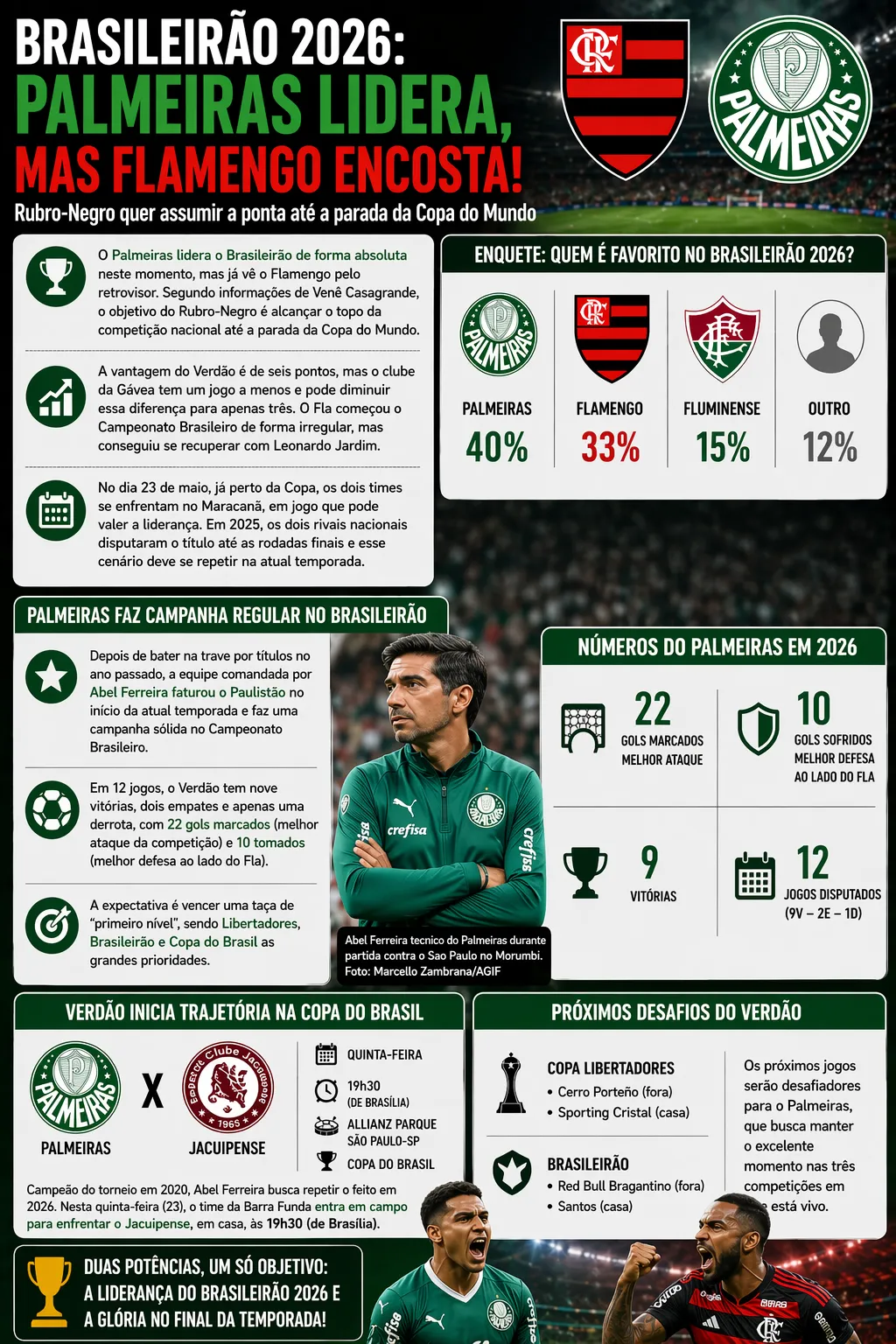 O Palmeiras lidera o Brasileirão de forma absoluta neste momento, mas já vê o Flamengo pelo retrovisor. Segundo informações de Venê Casagrande, o objetivo do Rubro-Negro é alcançar o topo da competição nacional até a parada para a Copa do Mundo, que será em junho.