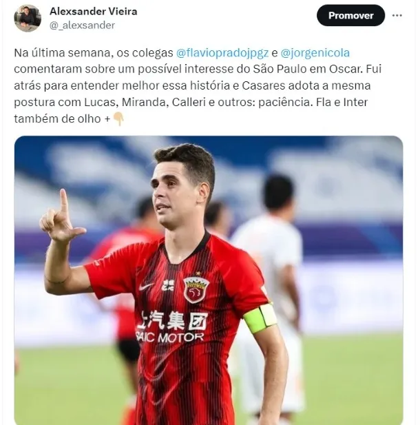 Portais chineses inclusive repercutiram que Oscar está nos momentos finais em sua passagem pelo país asiático. Existia a possibilidade do jogador ficar até o fim de sua carreira para alinhar um cargo diretivo, mas é do interesse dele e de sua família voltar ao futebol brasileiro.