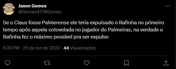 “Rafinha chora demais devia se aposentar e virar comentarista”, “Se o Claus fosse Palmerense ele teria expulsado o Rafinha no primeiro tempo após aquela cotovelada no jogador do Palmeiras, na verdade o Rafinha fez o máximo possível pra ser expulso” e “Ele foi expulso com atraso de 30 minutos, realmente é palmeirense KKKKKKKKK”, foram alguns dos comentários.