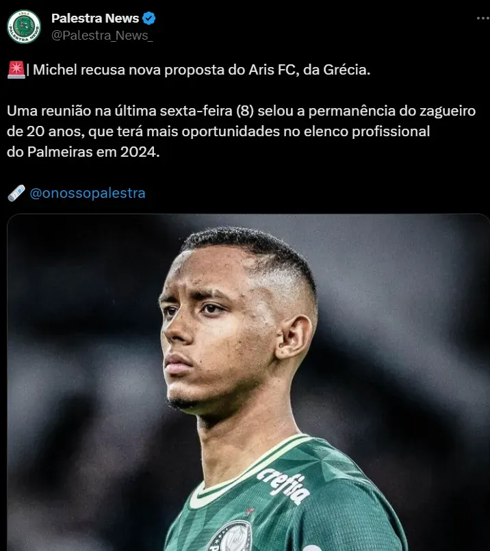 Zagueiro Michel já sabe o que acontecerá no seu futuro. A equipe paulista negou mais uma proposta do Aris FC, da Grécia e anunciou para o atleta e sua staff os seus planos. Ideia é que o defensor receba mais oportunidades na equipe profissional em 2024.