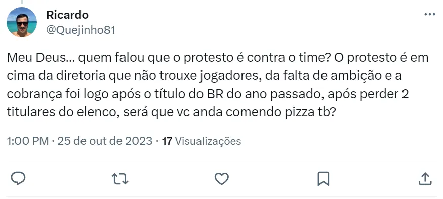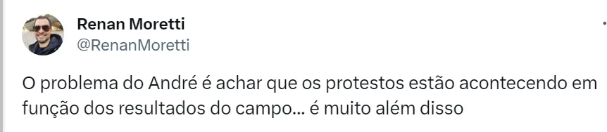 O protesto teve como foco a presidente Leila e conselheiros do clube. Nesta quarta-feira (25), em vídeo divulgado pelo Globo Esporte, o apresentador André Rizek discordou dos protestos no Verdão. O jornalista concorda que ocorreram erros da gestão do Palmeiras na temporada, como a falta de reforços, mas vê exagero nas reclamações e lembra que nenhum time vai ser campeão todo ano.