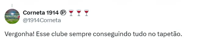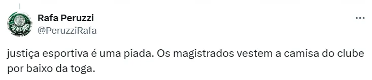Em entrevista ao GE, Anderson Barros, gerente de futebol do Verdão, se mostrou indignado com a decisão do órgão competente. Para ele, foi aberto um precedente perigoso para casos parecidos no futuro.